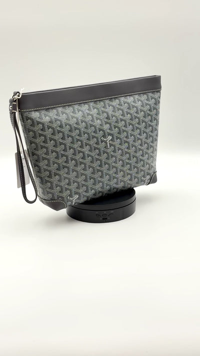 A sleek and versatile pouch from Maison Goyard, crafted in the iconic Goyardine coated-canvas with Chevroches calfskin leather trim. Designed with a wrist strap for handheld or wrist wear, it transitions effortlessly from daytime bag organizer to evening clutch.