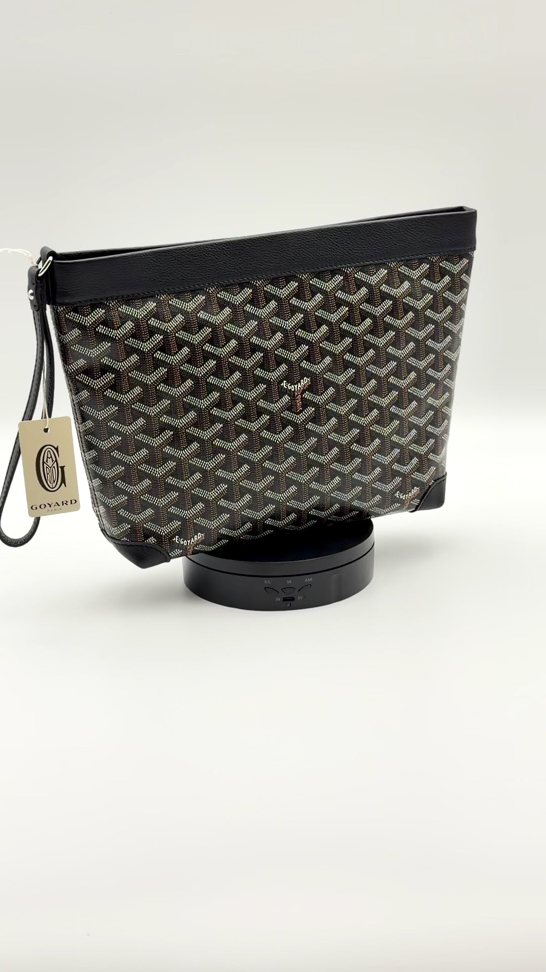 A sleek and versatile pouch from Maison Goyard, crafted in the iconic Goyardine coated-canvas with Chevroches calfskin leather trim. Designed with a wrist strap for handheld or wrist wear, it transitions effortlessly from daytime bag organizer to evening clutch.