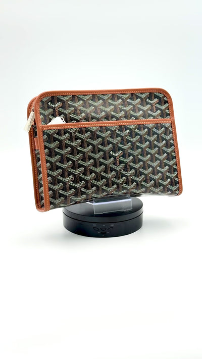 A refined and versatile piece from Maison Goyard, the Jouvence MM combines the iconic Goyardine coated canvas with supple Chevroches calfskin leather and palladium-tone hardware. Its clean, structured silhouette and compact size make it a perfect daily companion — easily carried by hand or inside a larger travel or business bag. The water-resistant interior and flat base ensure both durability and timeless elegance.