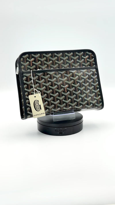 A refined and versatile piece from Maison Goyard, the Jouvence MM combines the iconic Goyardine coated canvas with supple Chevroches calfskin leather and palladium-tone hardware. Its clean, structured silhouette and compact size make it a perfect daily companion — easily carried by hand or inside a larger travel or business bag. The water-resistant interior and flat base ensure both durability and timeless elegance.