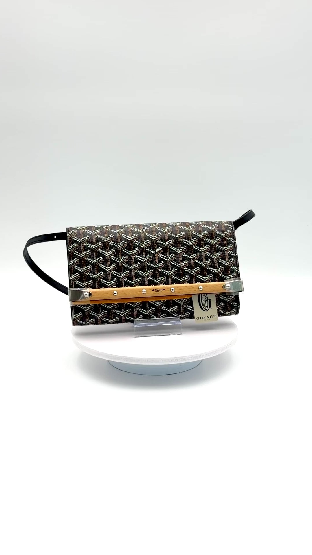 An elegant tribute to trunk-making heritage, this clutch features Goyard's iconic Goyardine coated canvas with calfskin leather trim, finished with a riveted beech-wood rod and corner brackets. It comes with a removable, adjustable leather strap allowing it to be carried by hand, worn on the shoulder, or cross-body.