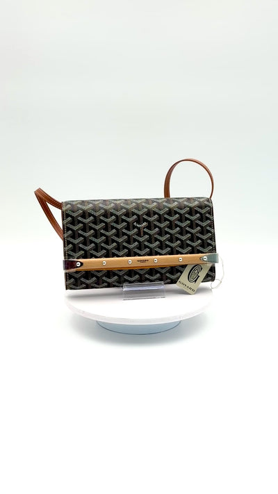 An elegant tribute to trunk-making heritage, this clutch features Goyard's iconic Goyardine coated canvas with calfskin leather trim, finished with a riveted beech-wood rod and corner brackets. It comes with a removable, adjustable leather strap allowing it to be carried by hand, worn on the shoulder, or cross-body.