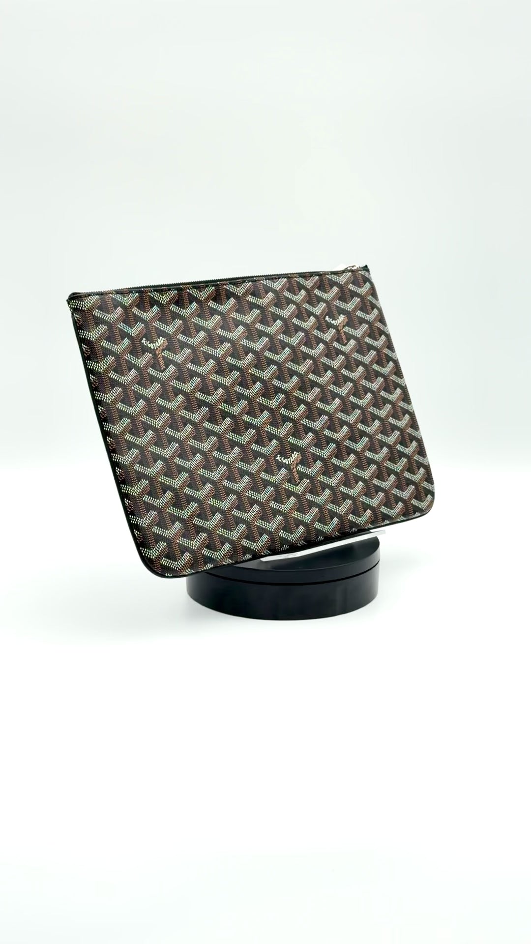 A minimalist yet refined clutch from Maison Goyard, crafted in the signature Goyardine coated-canvas with calfskin leather trim. Secured by a top zip closure and featuring an interior card pocket, this piece offers sleek functionality and refined styling, whether carried alone or inside another bag.